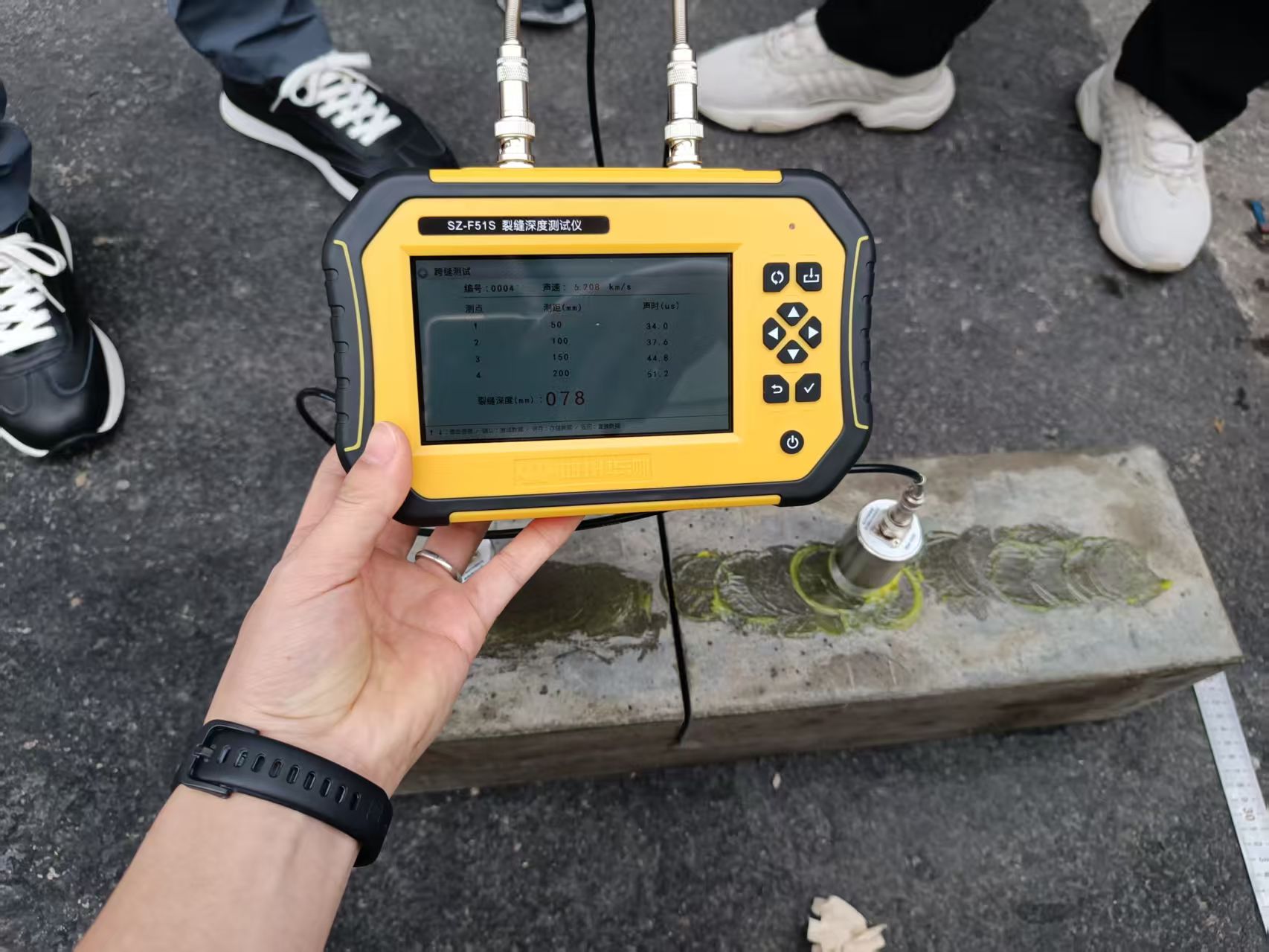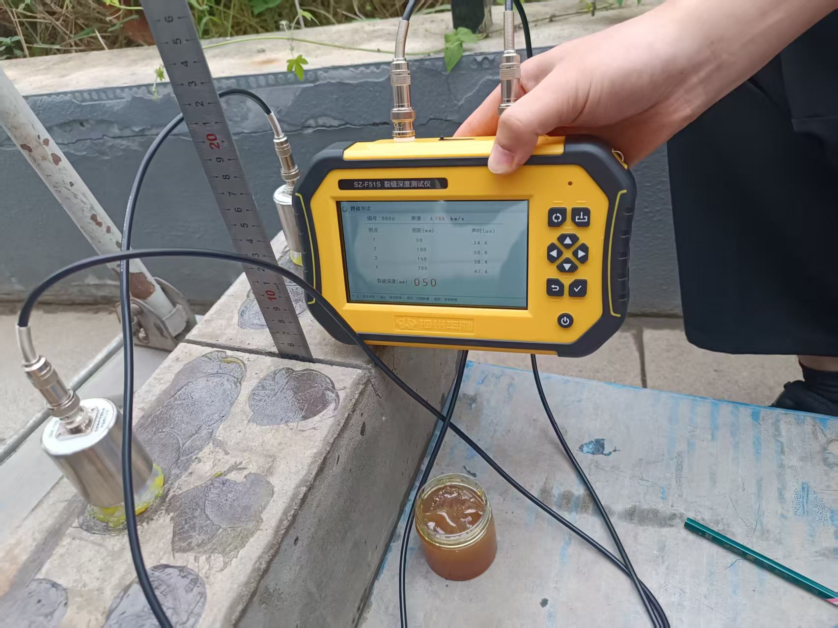 在模拟混凝土试块的检测环节,SZ-F51S的性能优势全面凸显。这款仪器基于声波绕射原理研发,搭载32位ARM内核处理单元,最大可测裂缝深度达650mm,测试误差≤10%,裂缝深度可以精确到0.1毫米,无需人工判读声参量,大幅提升检测效率。其包胶外壳设计兼顾便携性与防护性,硅胶防水键盘适配复杂工程环境,可拆卸松下锂电池支持充电宝应急充电,完美匹配现场检测的多样需求。参测机构反馈,SZ-F51S在不同深度裂缝的模拟试块检测中,数据精准度远超预期,且操作流程简易,新手也能快速上手。